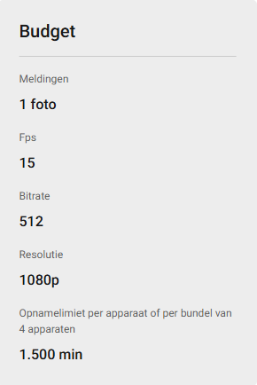 1 camera, 512bps, 15Fps, resolutie van 1080p, 1 picture Push notificatie voor 30 dagen met limiet op 1500 min. Licentie per maand
